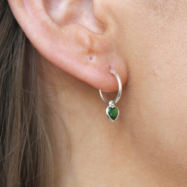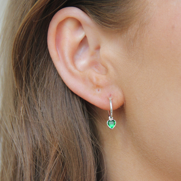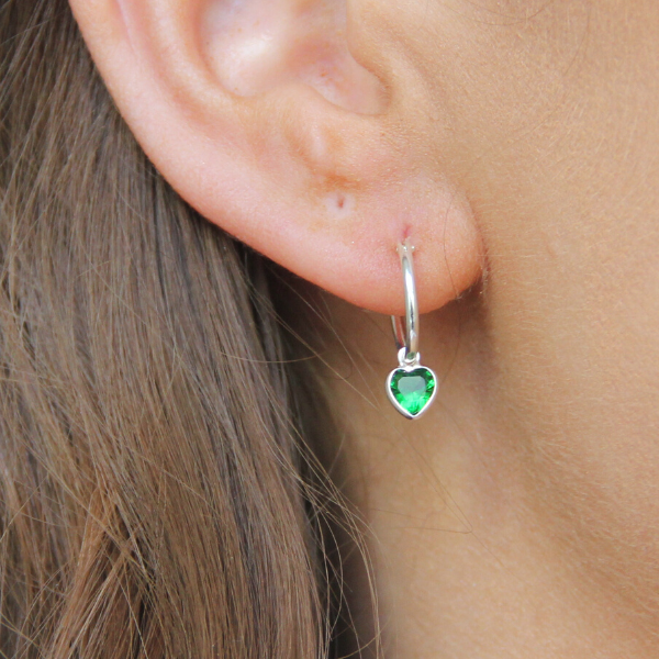 Supersöt liten creol med ett hängande grönt cubic zirkonia-hjärta. Hjärtat går att ta bort så man kan använda endast creolen. Creolen är en tunn creol, ca 12-14mm i diameter. Hjärtat mäter cirka 5mm i diameter.
