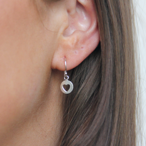 Ett par små söta örhängen i form av ett ihåligt hjärta på en silverbricka. Brickan mäter 8mm i diameter. Perfekta att ge bort till någon du håller kär.