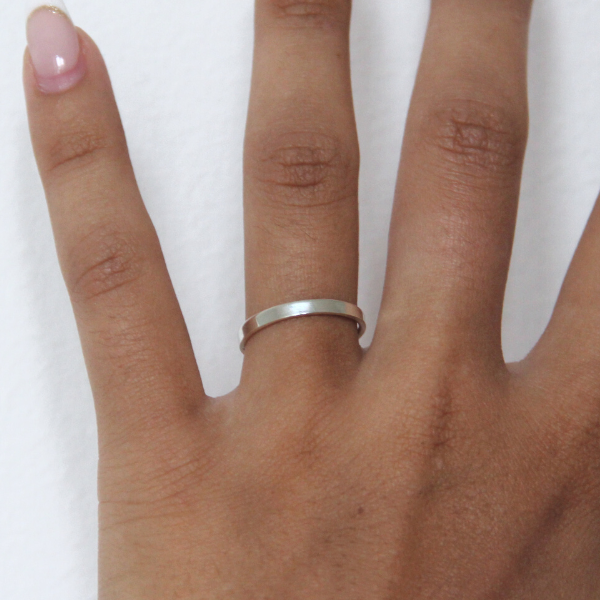 En ring som är 2 mm bred med kantiga sidor. Klassiskt och tidlöst och passar fantastiskt bra tillsammans med många tunna ringar i olika former på fingrarna, alternativt ensam, för en enkel och stilren look.
