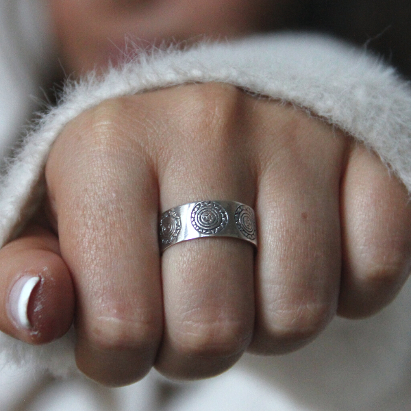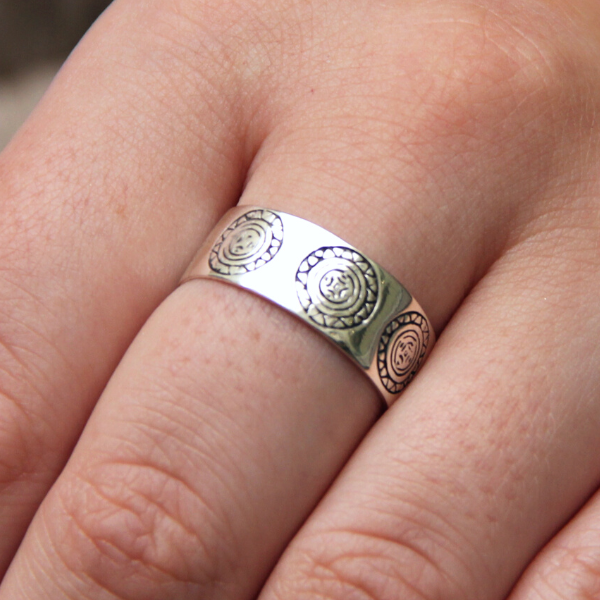 Silverring i brett silver med vackert mönster i inka-stil. Våra silverringar är alltid tillverkade av äkta sterling silver.
