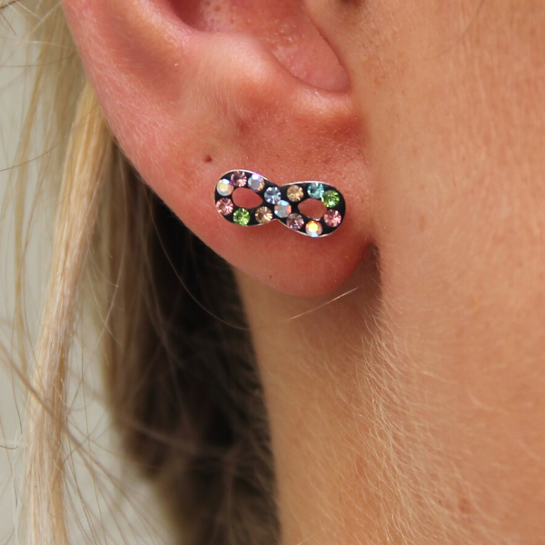 Ett par fantastika örhängen med strass i olika färger i form av ett infinity tecken. Örhänget mäter ca 12x5mm.