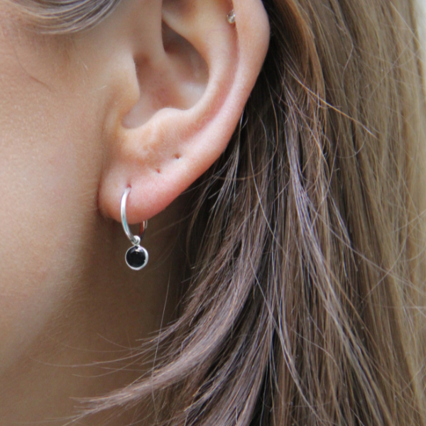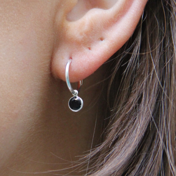 Supersöt liten creol med en hängande svart cubic zirkonia-sten. Stenen går att ta bort så man kan använda endast creolen.