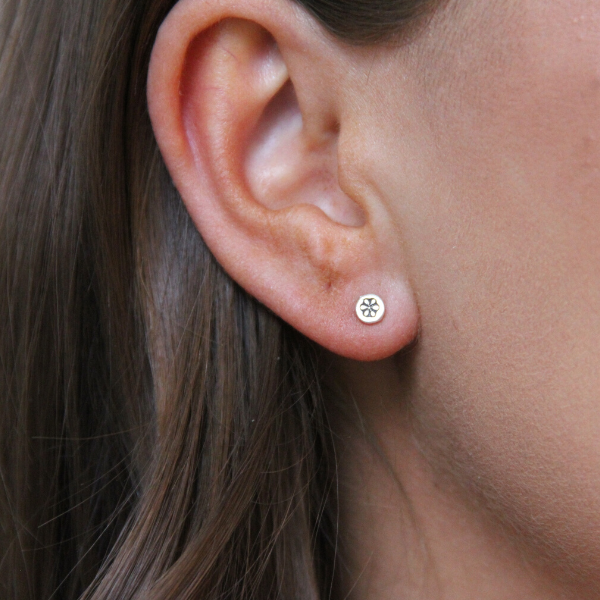 Ett par små söta örhängen med en stämplad oxiderad blomma. Örhänget mäter ca 5mm i diameter.