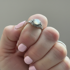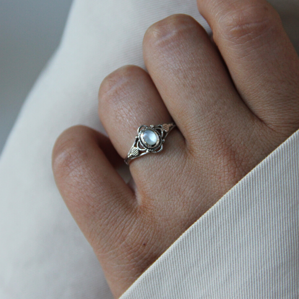 En supersöt liten ring i gammal stil med en liten sten av pärlemor i mitten. Pärlemor är ett levande material och ringen kan skifta i olika nyanser av vit/beige.