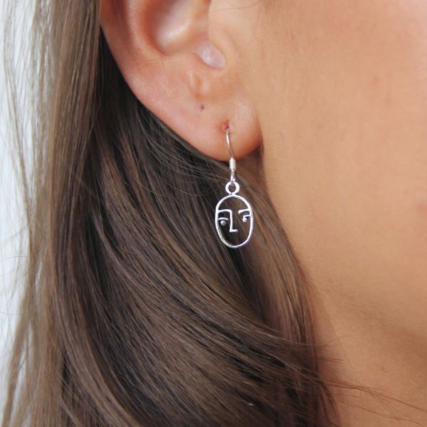 Ett par örhängen med ett minimalistiskt ansikte som dinglar snyggt i öronen. Ansiktet mäter 12x9mm.