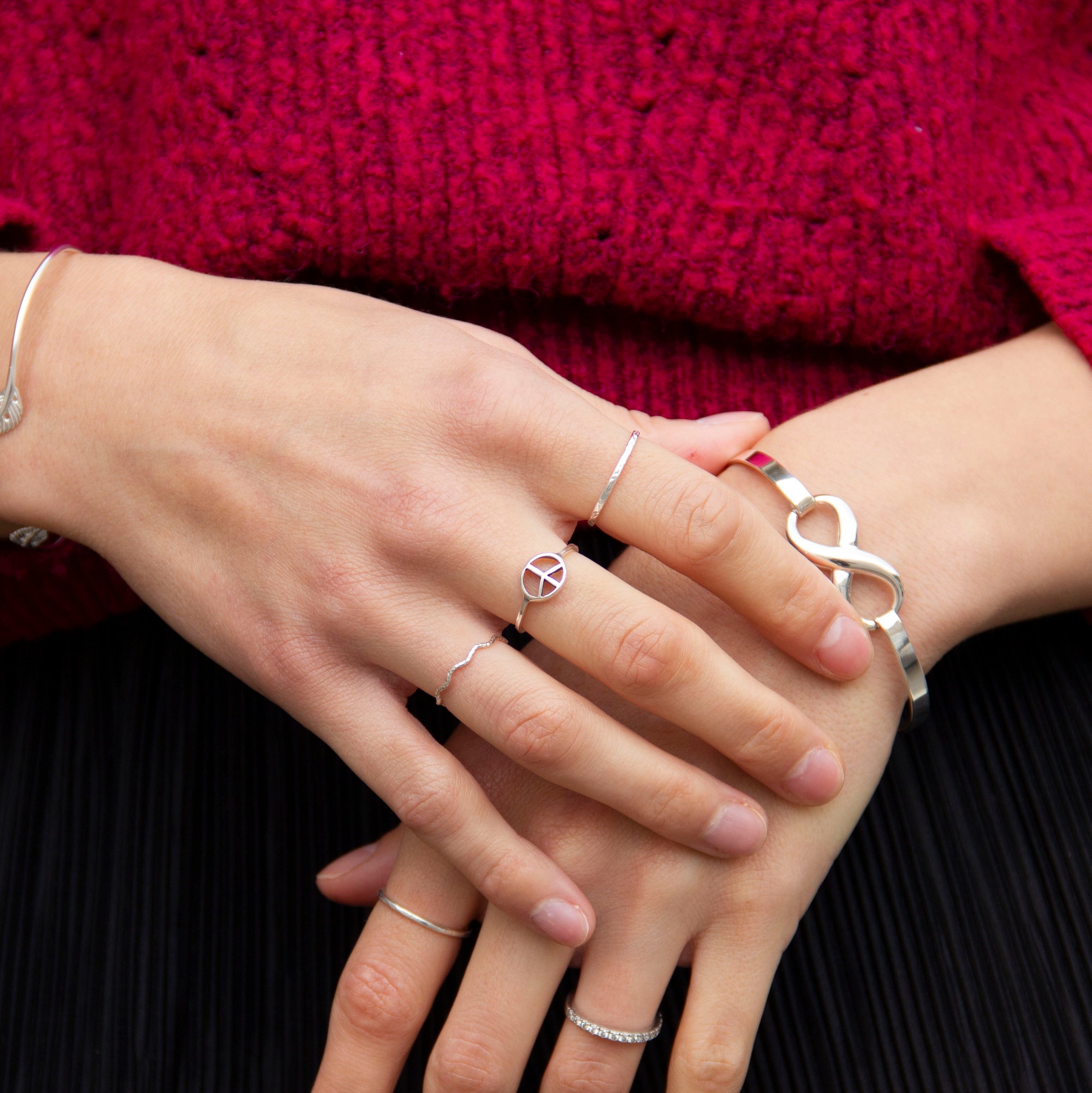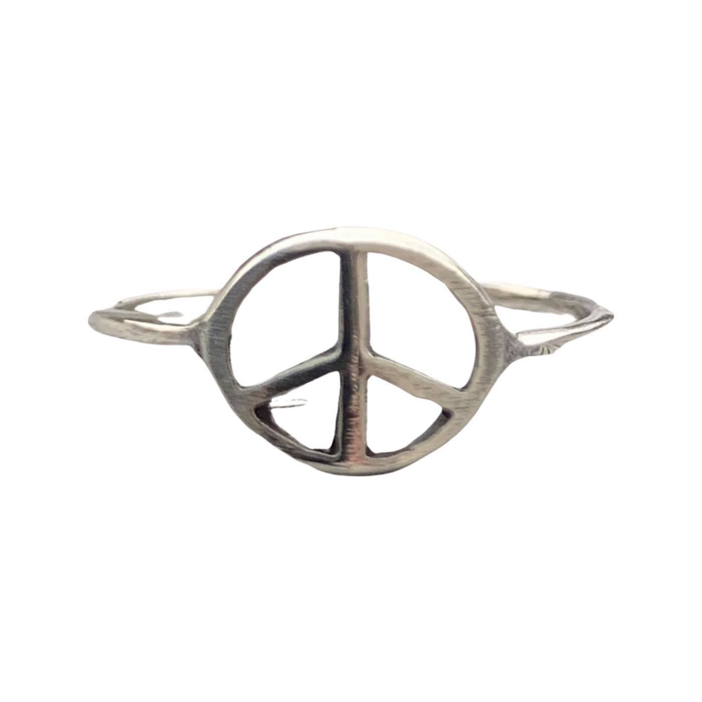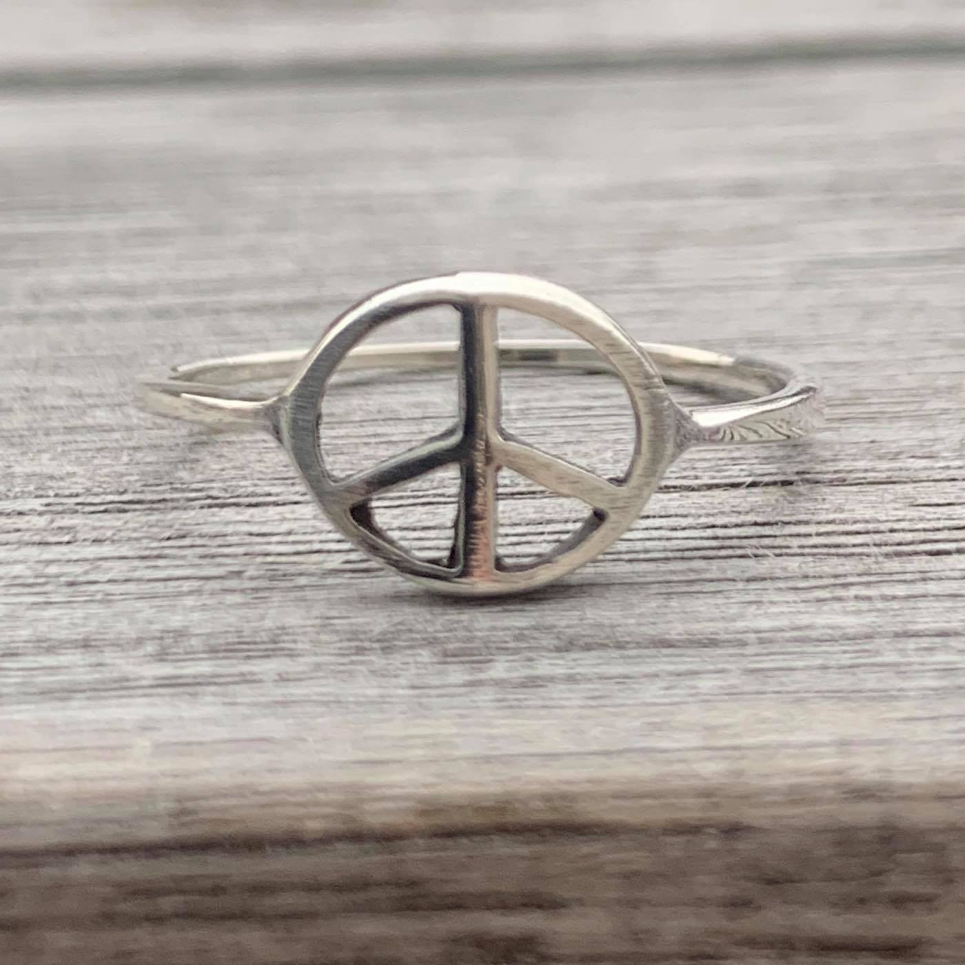 Tunn ring med peacetecken. Peacetecknet är 9 mm i diameter. Själva ringen är tunn och enkel.