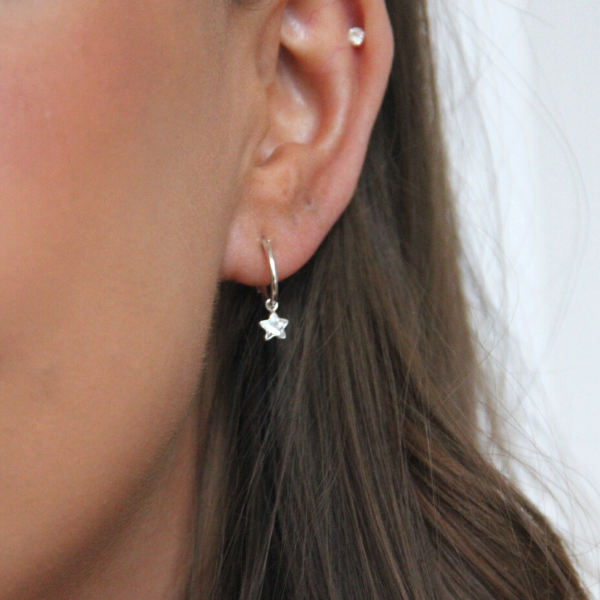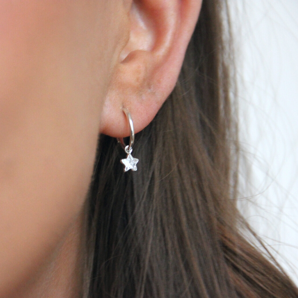 Ett par supersöta silverhoops med en hängande vit cubic zirkonia-stjärna. Stjärnan går att ta bort så man kan använda endast hoopsen . Stjärnan mäter 5mm i diameter och hoopsen 12mm i diameter och 1,2mm i tjocklek.