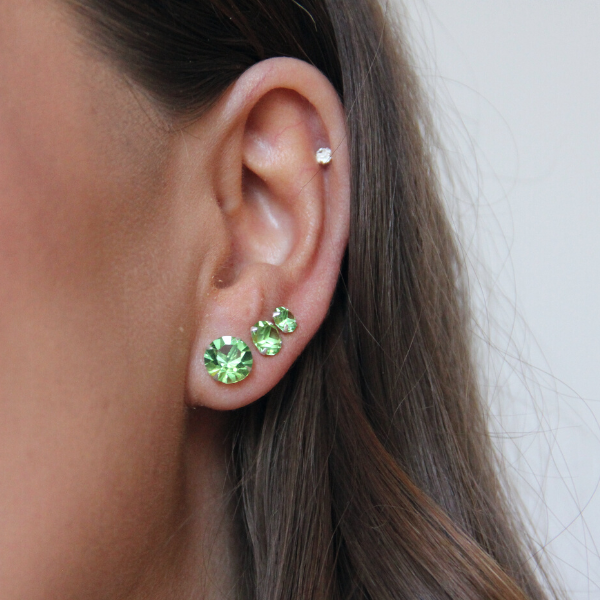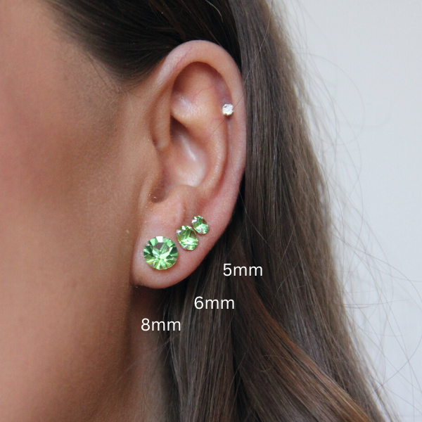 Ett par otroligt vackra örhängen med två fasettslipade Cubic Zirconia stenar. Finns i flera olika storlekar. Du väljer storlek i menyn. Snyggt att ha flera storlekar i samma öra! Denna färg kallas "Peridot" enligt färgkartan. De storlekar som syns i menyn är de som finns i lager.
