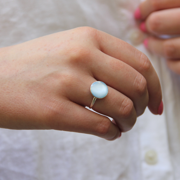 En fin silerring med en ljusblå pärlemorplatta upptill. Ovansidan mäter cirka 12mm i diameter.