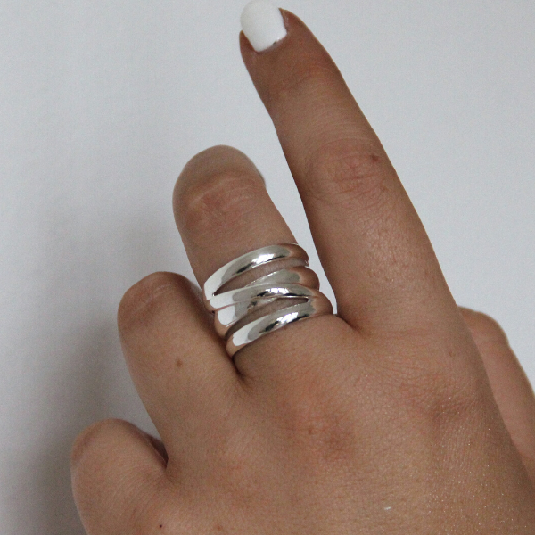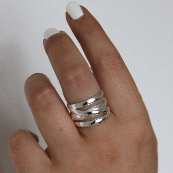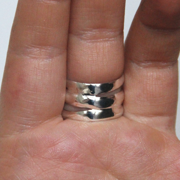 En vacker bred ring som täcker en stor del av fingret med gediget silver. Ser lite ut som att du har många "stackade" ringar där den ena är i kors. Tänk på att när en ring täcker en större del av fingret kan man behöva en större storlek än på en tunn ring.