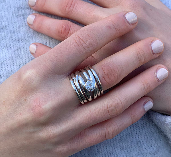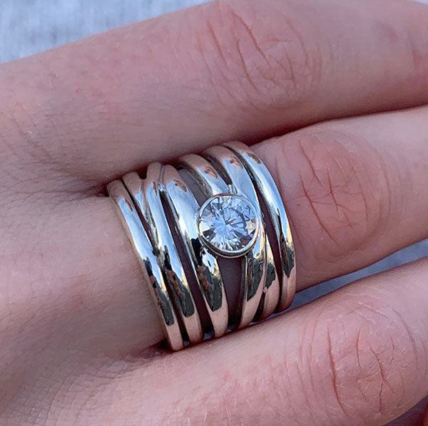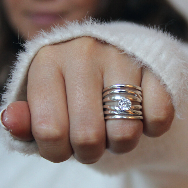 Härlig stor ring med cubic zirkonia. Denna ring syns! Tänk på att en bred ring ofta kräver en lite större storlek eftersom den täcker en större del av ditt finger.