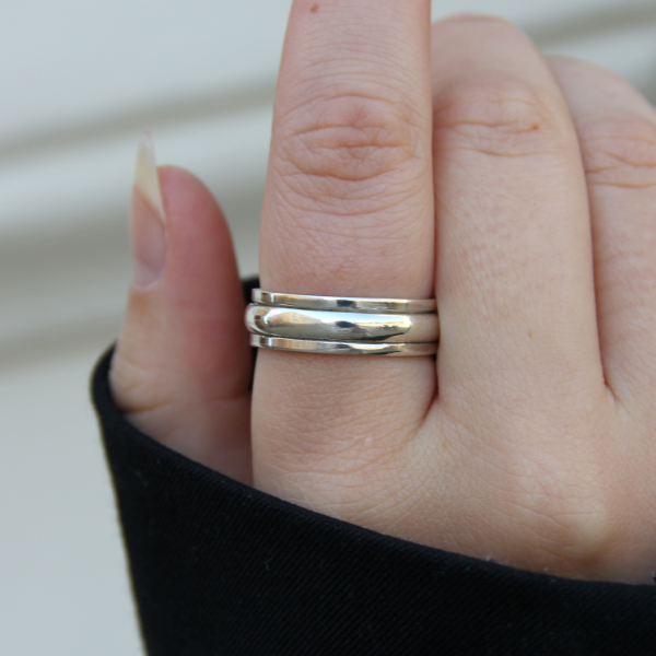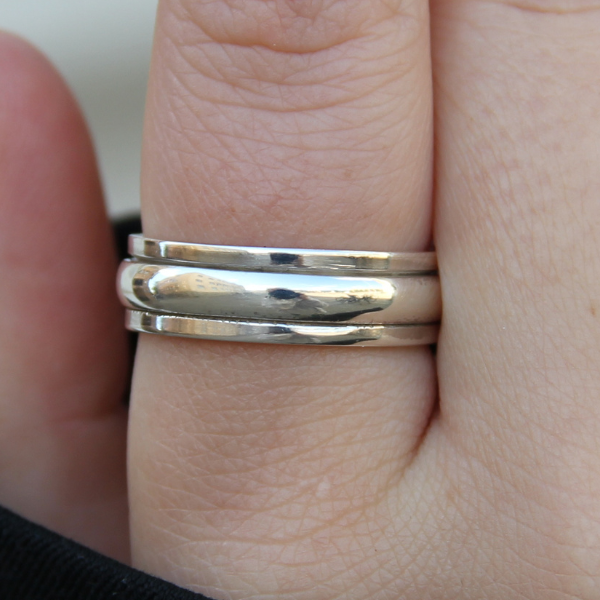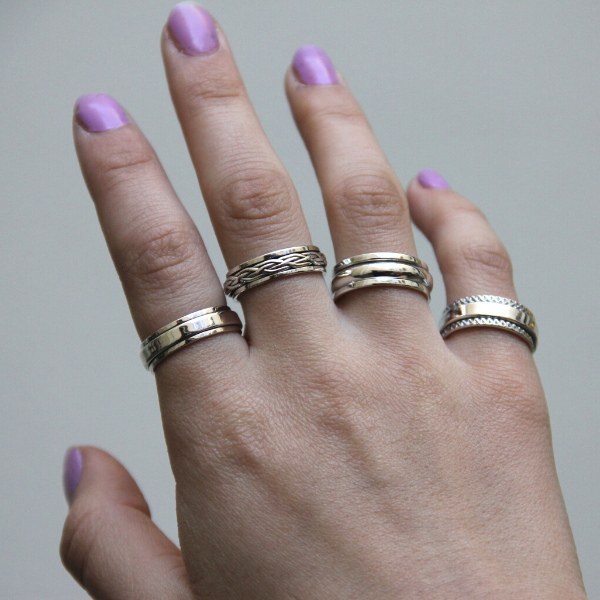 En otrolig spinner ring, som är en ring utanpå en annan ring. Den yttre ringen går att snurra på och kallas därför spinner ring. Denna ring kan fungera som anti-stress. Den yttre ringen är rundad och den inre är rak, vilket ger in fin konstrast till varandra.
