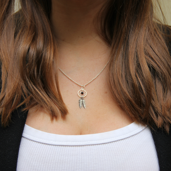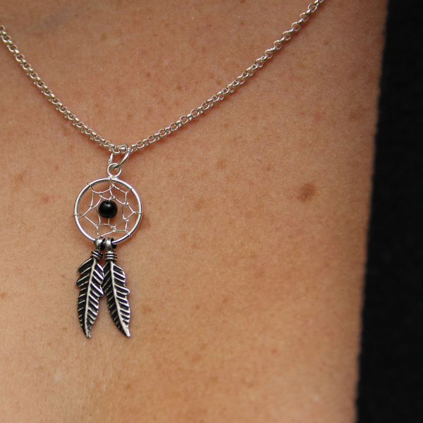 En fin drömfångare att hänga runt halsen för att fånga upp dina mardrömmar. Hela halssmycket ink. fjädrarna mäter 27x11mm.