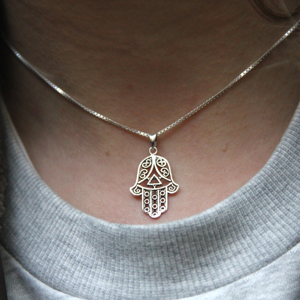 Vackert halssmycke med Fatimas hand. Fatimas hand symboliserar gudomligt beskydd och anses också bringa tur. Den anses också skydda dig mot ”det onda ögat". Enligt denna tro kan en människa överföra negativa krafter på dig genom att stirra på dig lite för länge. Fatimas hand anses då hålla de onda krafterna borta. Fatimas hand är vanligast i smycken, men man ser också tecknet på dörrar, för att hålla ondskan utanför hemmet.
