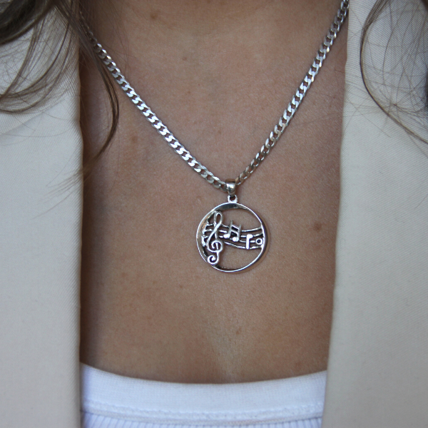 Vackert halssmycke i äkta silver för musikälskaren! En rejäl cirkel av silver med musiknoter och G-klavar. Har du en musiktok i familjen är detta en given present! Halskedja ingår inte men du kan välja till en i menyn för kedjor.