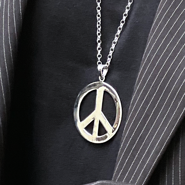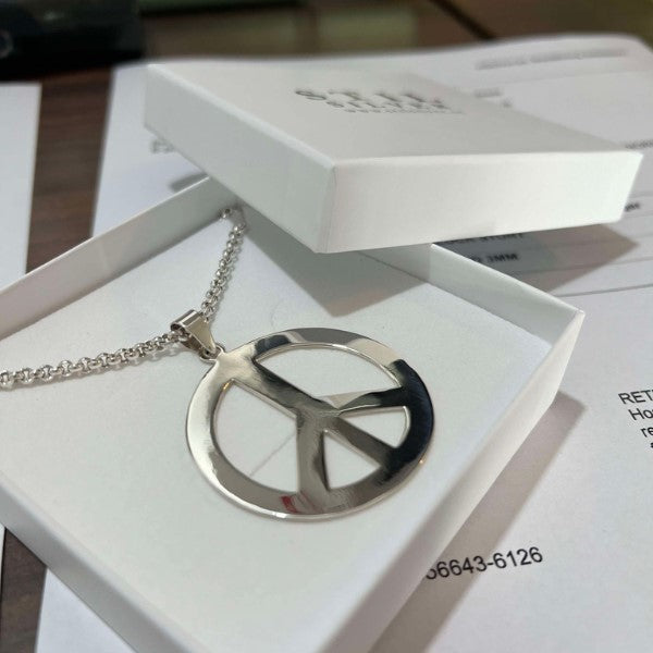 Peacemärket skapades år 1958 av en konstnär/artist vid namn Gerald Holtom. Symbolen togs fram till en protestmarch i London mot atomvapen. Så småningom kom den att bli en symbol för allt motstånd mot kärnvapen och under 60 och 70-talet tog freds-/hippierörelserna det vidare under citatet ”Make Love not war” och det blev då en fredssymbol för hela världen. Genom att bära ett peace-märke visar du världen att du är emot krig och FÖR fred! Detta är det största peacemärket som är 40 mm i diameter. Silvrets bredd är 5 mm. Till detta halssmycke passar en gedigen ärtlänk.