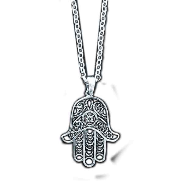 Vackert halsband med Fatimas hand. Fatimas hand symboliserar gudomligt beskydd och anses också bringa tur. Den anses också skydda dig mot ”det onda ögat. ”Enligt denna tro kan en människa överföra negativa krafter på dig genom att stirra på dig lite för länge. Fatimas hand anses då hålla de onda krafterna borta. Fatimas hand är vanligast i smycken, men man ser också tecknet på dörrar, för att hålla ondskan utanför hemmet.