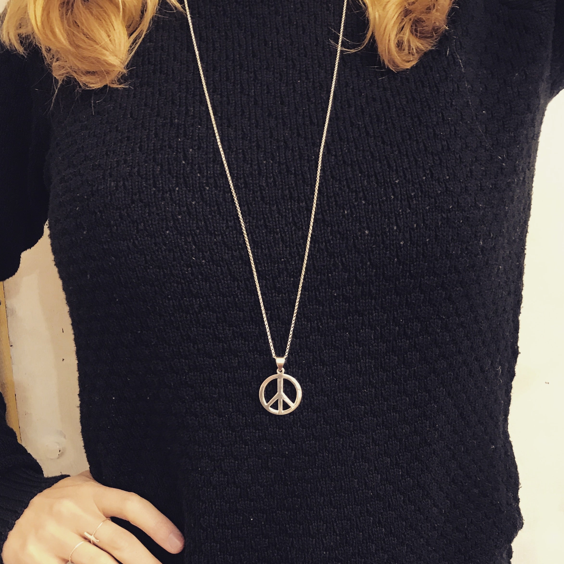 MAKE LOVE, NOT WAR! Peacemärket skapades år 1958 av en konstnär/artist vid namn Gerald Holtom. Symbolen togs fram till en protestmarch i London mot atomvapen. Så småningom kom den att bli en symbol för allt motstånd mot kärnvapen och under 60 och 70-talet tog freds-/hippierörelserna det vidare under citatet ”Make Love not war” och det blev då en fredssymbol för hela världen. Genom att bära ett peace-märke visar du världen att du är emot krig och FÖR fred! Kedja ingår ej utan det väljer du själv i menyn.