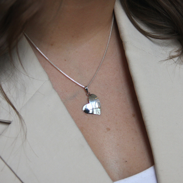 Ett halssmycke med ett blankt hjärta på snedden. Hjärtat mäter ca 20x20mm.