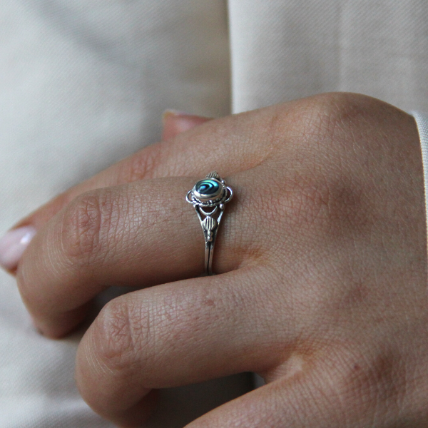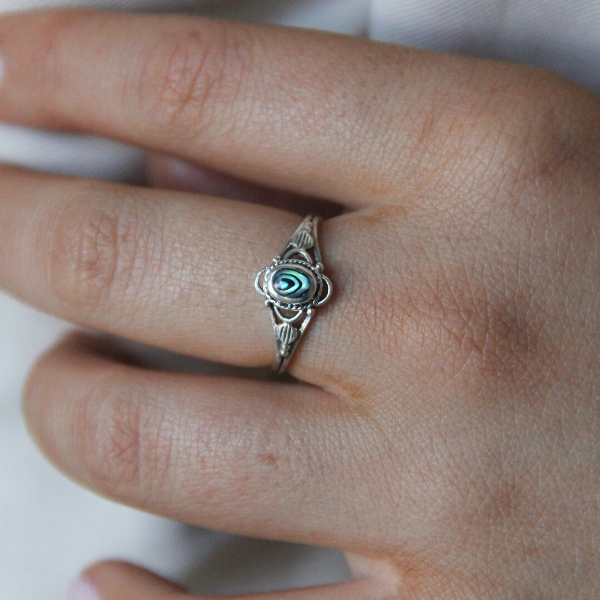En supersöt liten ring i gammal stil med en liten sten av pärlemor i mitten. Pärlemor är ett levande material och ringen kan skifta i olika nyanser av regnbågens färger.