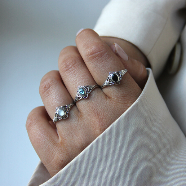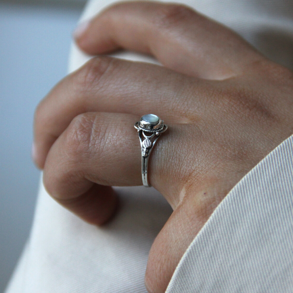 En supersöt liten ring i gammal stil med en liten sten av pärlemor i mitten. Pärlemor är ett levande material och ringen kan skifta i olika nyanser av vit/beige.