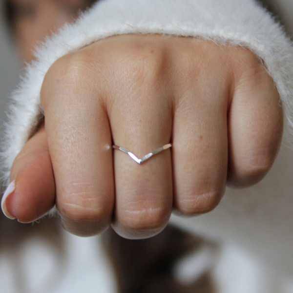 Jättesöt, tunn ring formad som ett V. Silvret är hamrat vilket ger en fin glittrande effekt. Silver är ett mjukt material och en tunn silverring kan komma att forma sig efter dina fingrar när du använt dem.