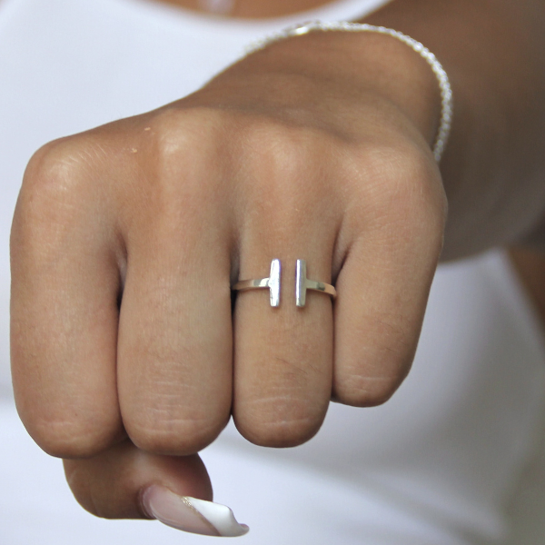 En söt liten ring med två "pinnar" mittemot varandra. Mellan pinnarna är det luft och ringen är alltså inte helt stängd.