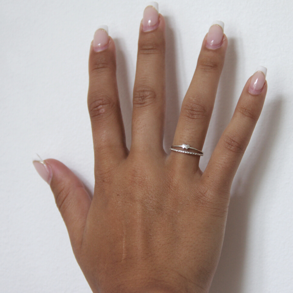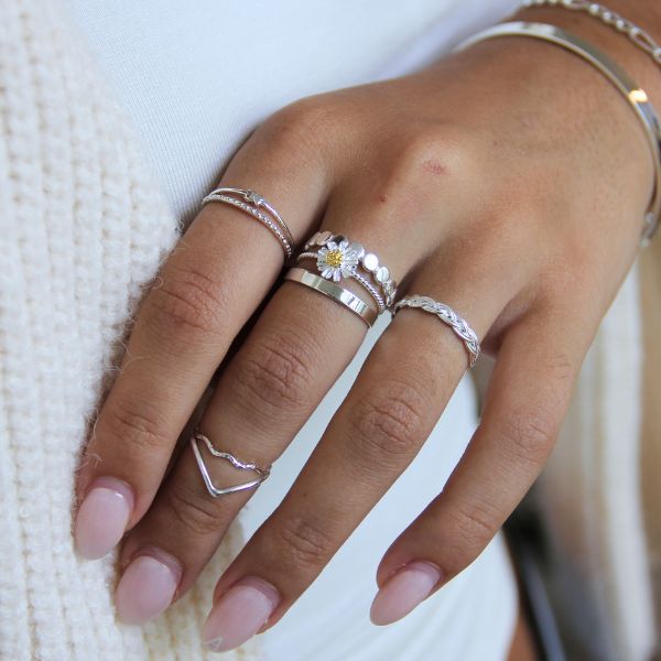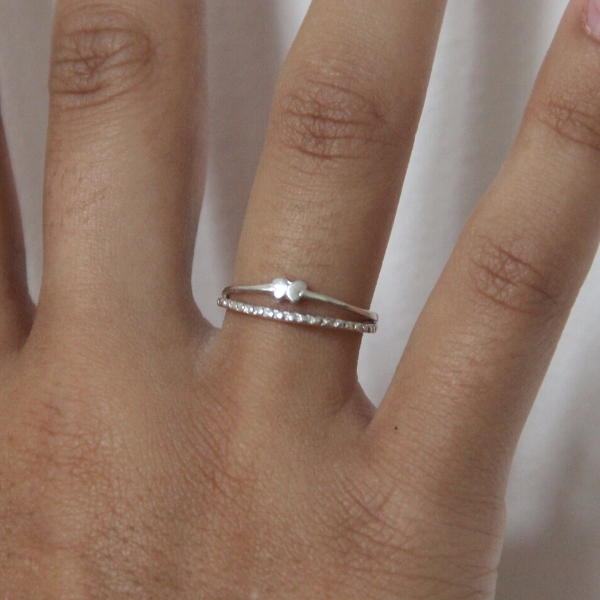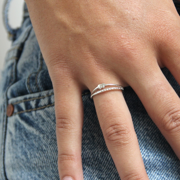 En supersöt liten ring som ser ut som två, där den ena har en liten söt fjäril och den andra är mönstrad.