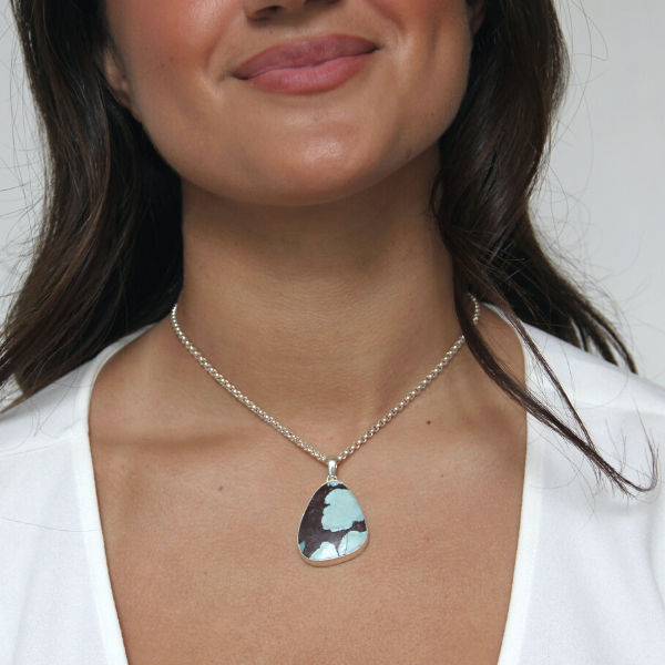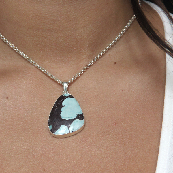 Ett fantastiskt vackert halssmycke i silver med äkta turkos. Väldigt vackert! Detta halssmycke mäter 46x28mm totalt. Kedja ingår ej, det väljer du själv till i menyn för kedjor om du önskar. TURKOS: Turkos sägs vara visdomens sten och den lär hjälpa dig att behålla och återställa balans. Den hjälper dig som kan behöva att öka din acceptans mot dig själv, att vara självförlåtande och hjälpa dig att bearbeta saker du inte kan påverka. Den hjälper också till att acceptera misstag och misslyckanden.