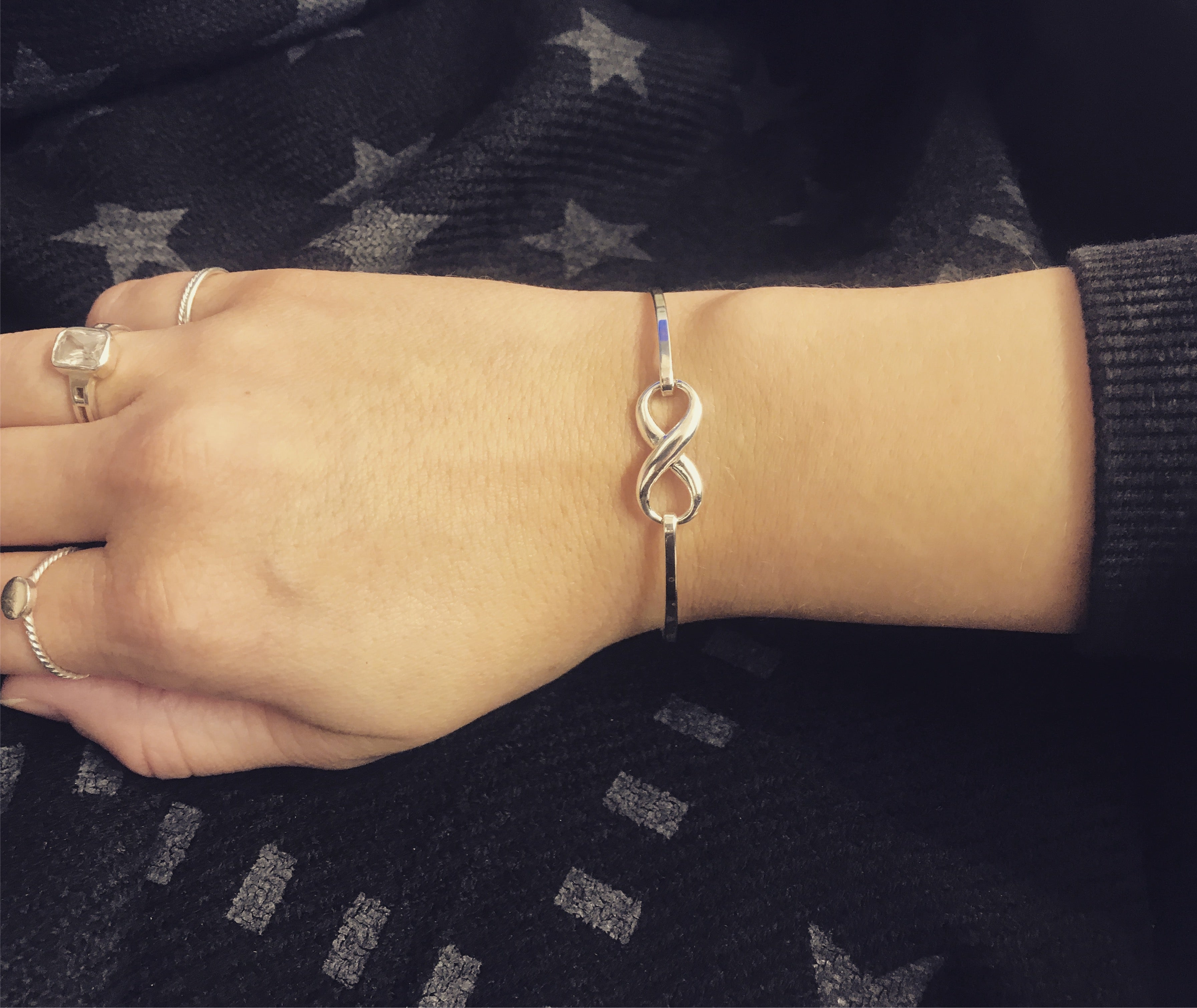 "Infinity, always and forever..." The infinity symbol has long been popular in jewelry. It can stand for eternal love, eternal friendship, or perhaps an eternal promise to yourself. The bracelet is available in 50x60 mm and 55x50mm in diameter and snaps open at the symbol itself so that it can be opened completely. The symbol is about 20 mm wide. The silver is 1.5 mm wide.