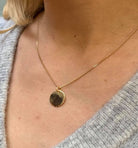 Beautiful necklace with a flat disc. The disc is approximately 15 mm in diameter and plated with 18k gold. We recommend a gold chain link to go with this.