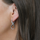 A pair of stylish silver hoops in the shape of a swirl, which at certain angles looks like an infinity sign. These stylish silver hoops measure approximately 30x15 at the widest points.