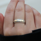 An incredible spinner ring, which is a ring on top of another ring. The outer ring can be spun and is therefore called a spinner ring. This ring can function as an anti-stress. The outer ring is plain and the other has a nice oxidized texture, which gives the ring a nice contrast.