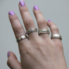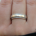 An incredible spinner ring, which is a ring on top of another ring. The outer ring can be spun and is therefore called a spinner ring. This ring can function as an anti-stress. The outer ring is plain and the other has a nice oxidized texture, which gives the ring a nice contrast. The ring is oxidized under the moving ring and a little oxidation may deposit on the finger right at the beginning of use. However, it is easy to wash off.