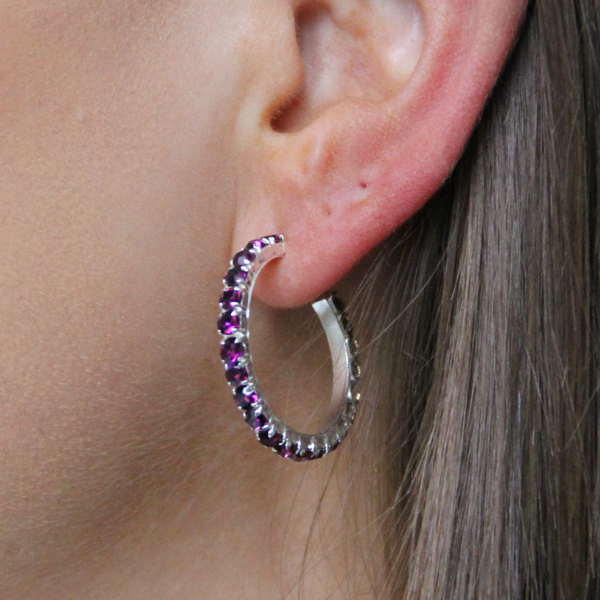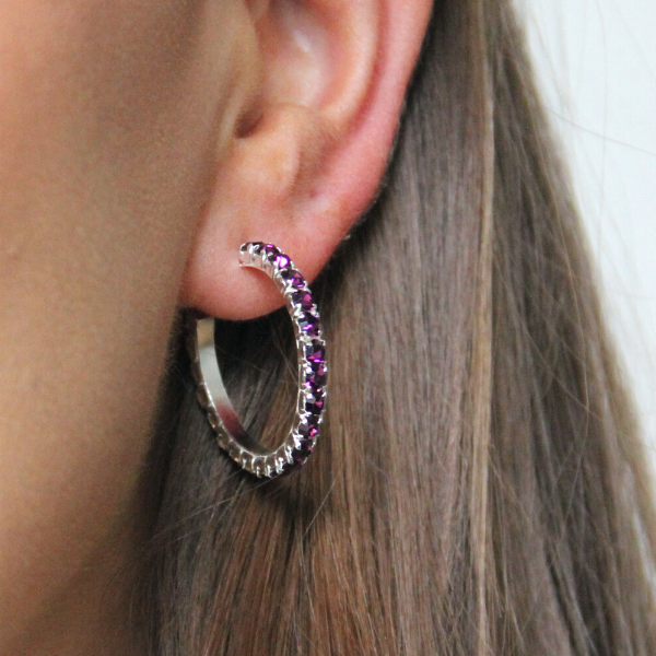Beautiful silver hoop earrings with dark purple stones that sparkle wonderfully. You will be the most stylish at the party!