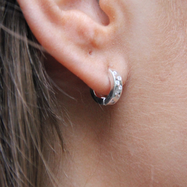 A pair of trendy silver earrings with small cubic zirconia stones. 12mm in diameter and 3mm wide.