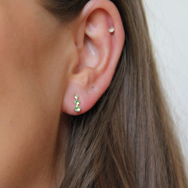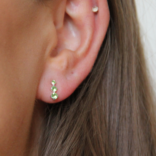 A pair of cute earrings with three stones in a row! The earring is 9mm long and the stones are about 2mm, 3mm and 3.5mm in size including the setting. The color according to the color chart is called "Peridot"