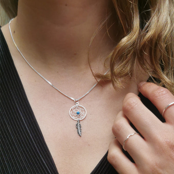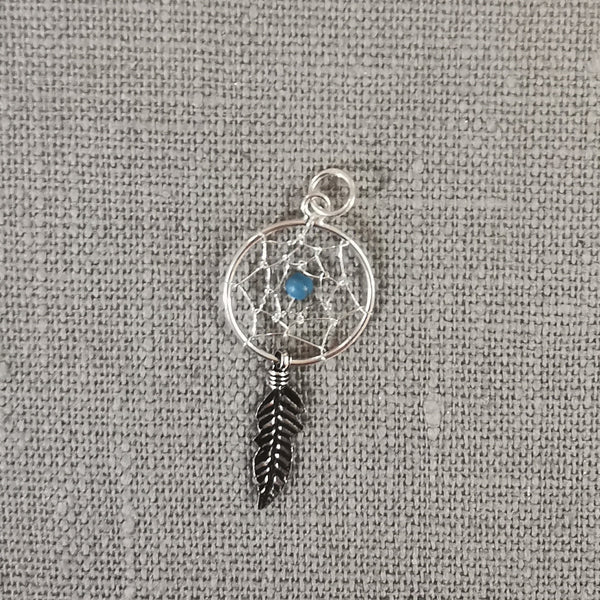 Söt drömfångare som är 15 mm i diameter. I mitten sitter en liten rund turkos (sten). Obs, Kedja medföljer ej utan du väljer själv kedja i menyn.