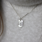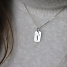 Ett halssmycke/berlock i form av ett kors och en bricka. Korset sitter inte fast på brickan utan är löst dinglande. Brickan är 17x12mm och korset är 12x8mm.