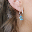 En creol med stift och en hängen sten. Creolen mäter 14mm i diamter. Stenen mäter 10mm i diameter. Färgen på stenen kallas "Aqua Bohemica".