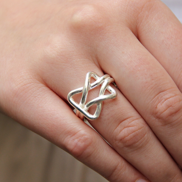 En ring med en fyrkantig "knut" av tjock silvertråd. Själva ringen som går runt handen består av två silvertrådar i bredd och är 4mm bred. Knuten är 15x18mm.
