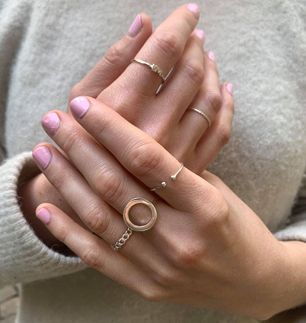 Den heter inte jumbo för att den kommer sist på vår lista, utan för att den är något bredare i silvret än vår ring som heter Kharma circle. Vår kharma circle silverring gjorde succé när vi lanserade den och är flitigt efterfrågad. Den sitter ursnyggt på handen, både som den är eller tillsammans med andra tunnare ringar.