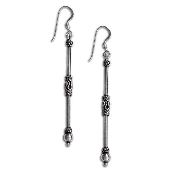 Snygga örhängen formade som långa pinnar med ett mönster på. Hela örhänget är ca 60 mm långt och själva pinnen är ca 45 mm lång.